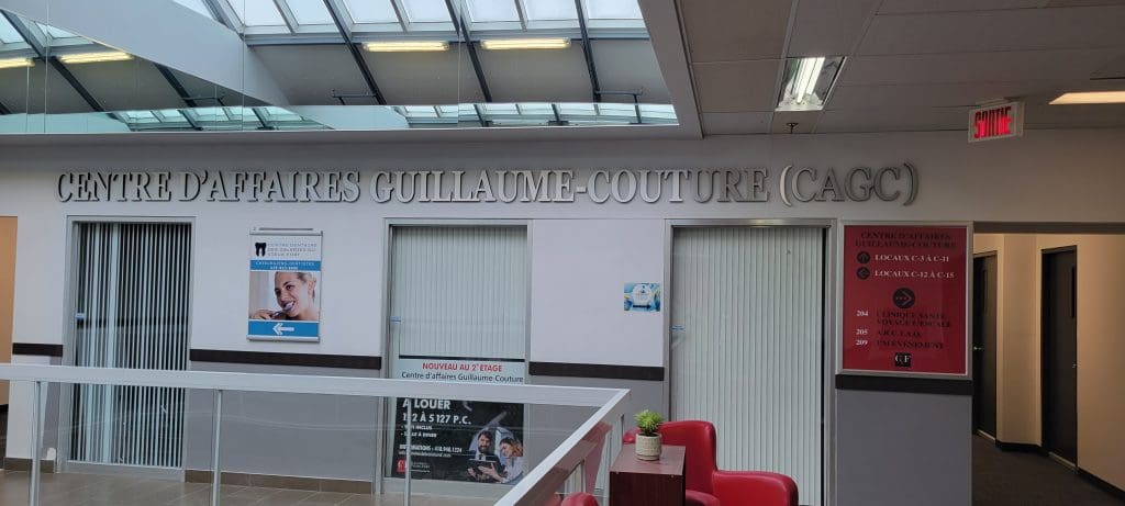 Situé au 2e étage des Galeries du Vieux Fort, le Centre d’affaires Guillaume-Couture vous offre des locaux rénovés de 234 à 500 p.c. à un coût très abordable. L’endroit est idéal pour tous les professionnels. Le Wifi est inclus avec la location. Vous aurez aussi accès à notre une salle de repas et vos clients bénéficieront d’espaces d’attente positionnés à l’extérieur de vos bureaux si vous le souhaitez. Plusieurs professionnels de la santé déjà sur place dont : clinique médicale, clinique dentaire, pharmacie, psychologues, relation d’aide, etc. Les Galeries du Vieux-Fort, c’est près de 20 boutiques, bureaux et services exclusifs. Notre centre bénéficie d’une visibilité et d’une accessibilité excellente. Nos locataires principaux : Maxi, SAQ, Uniprix, Tigre Géant. Attraits à proximité : Cégep de Lévis, Parc industriel , Complexe administratif Desjardins, etc.